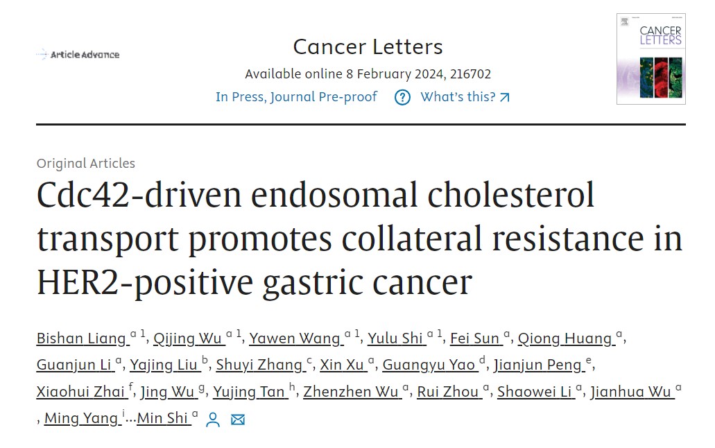 2月8日,南方医科大学石敏团队在期刊《Cancer Letters》上在线发表题为“Cdc42-driven endosomal cholesterol transport promotes collateral resistance in HER2-positive gastric cancer”的研究论文,研究验证了曲妥珠单抗与化疗之间的交叉耐药性现象和机制,并提出了一种在曲妥珠单抗耐药HER2阳性GC二线治疗中潜在的治疗靶点和策略。
