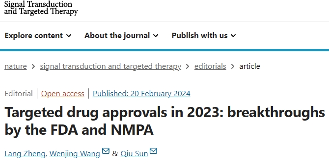 2月20日,四川大学华西医院孙秋研究团队在期刊《Signal Transduction and Targeted Therapy》上发表了题为“Targeted drug approvals in 2023: breakthroughs by the FDA and NMPA”的研究论文,本研究梳理了2023年获FDA和NMPA批准的靶向药物。