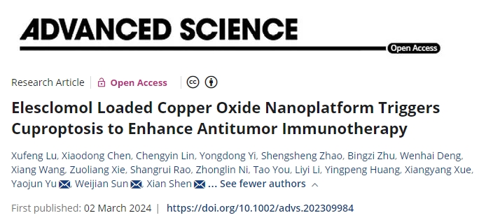 3月2日,温州医科大学沈贤/孙维建/俞耀军研究团队在期刊《Advanced Science》上发表了题为“Elesclomol Loaded Copper Oxide Nanoplatform Triggers Cuproptosis to Enhance Antitumor Immunotherapy”的研究论文,本研究结果可为铜死亡介导的抗肿瘤治疗提供一种新策略,可能增强免疫检查点抑制剂治疗的疗效。