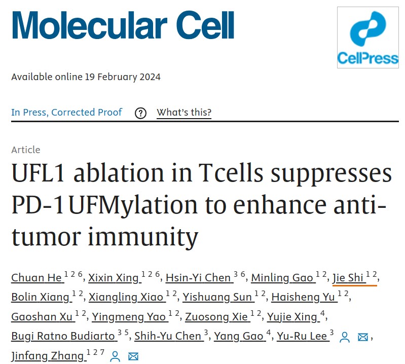UFMylation 是一种新兴的泛素样 (UBL) 修饰系统,它利用涉及 E1(泛素激活酶 5、UBA5)、E2(UFM1-共轭酶 1、UFC1)和 E3(UFM1-连接酶 1、UFL1,也称为 RCAD、KIAA0776、NLBP 或 MAXER)的三酶级联反应,将泛素折叠修饰物 1 (UFM1) 共价偶联到靶向蛋白质。与对泛素化功能的广泛研究相比,UFM化作用的生理作用探索较少。目前,只有 UFL1 被鉴定为 UFMylation E3 连接酶。UFL1介导的UFM化在调节胚胎发育、内质网(ER)稳态和内质网自噬、DNA损伤反应和病毒感染后干扰素反应中的功能重要性得到了强调。尽管在癌症中已经报道了异常的UFM化,但这些研究主要集中在了解UFMylation的肿瘤内在功能上,UFMylation在肿瘤发生中发挥着矛盾的作用,这取决于不同的癌症类型。尽管 T 细胞在控制肿瘤生长和基于 T 细胞的癌症免疫疗法中起着至关重要的作用,但 T 细胞中 UFMylation 和 T 细胞介导的抗肿瘤免疫的潜在功能仍未得到探索。