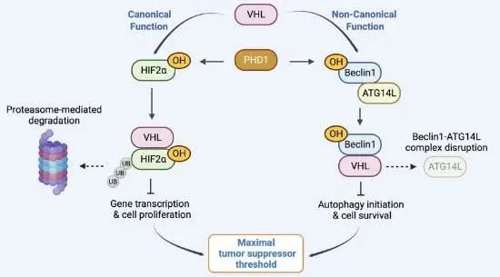 PHD1介导的脯氨酰羟基化靶向HIF-1α进行VHL依赖性泛素化,是细胞氧传感机制的关键步骤。这项工作表明,PHD1 和 VHL 还抑制 Beclin1 和自噬起始,失调导致透明细胞肾细胞癌进展。(转化医学网360zhyx.com)