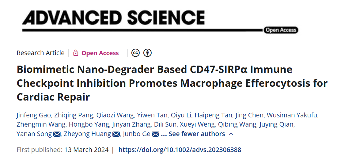 3月13日,复旦大学葛均波、黄浙勇、宋亚楠共同通讯在期刊《ADVANCED SCIENCE》上在线发表题为“Biomimetic Nano-Degrader Based CD47-SIRPα Immune Checkpoint Inhibition Promotes Macrophage Efferocytosis for Cardiac Repair”的研究论文,本研究提供了一种基于仿生纳米系统的CD47-SIRPα免疫检查点抑制蛋白质降解策略,该策略可以有效降解POI,超越传统TPD方法的固有局限性,具有显著的临床转化潜力。