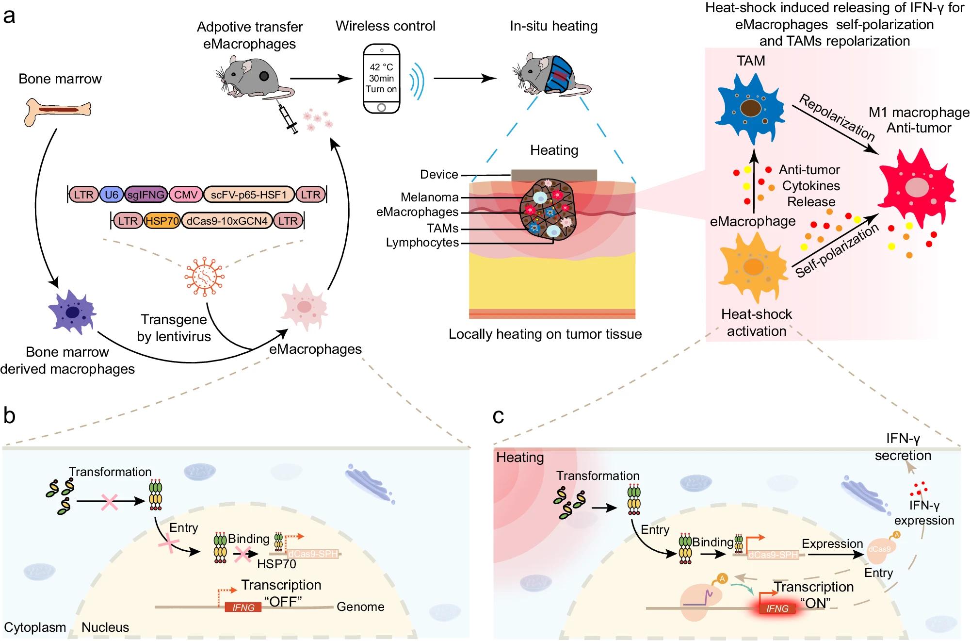 在此,我们开发了一种工程巨噬细胞(eMac),它可以通过无线遥控在肿瘤组织中局部分泌IFN-γ,以诱导它们向M1表型极化,用于癌症免疫治疗(图1)。值得注意的是,凭借基于HSP70的热休克促进剂,eMac的IFN-γ的生产由无线控制的智能可穿戴加热设备(iWarm)精确调节,该设备时空控制内源性基因的激活和失活,以避免不必要的副作用。eMac通过用户友好的智能设备进行远程控制的极化有望成为过继细胞治疗的个性化精准药物。