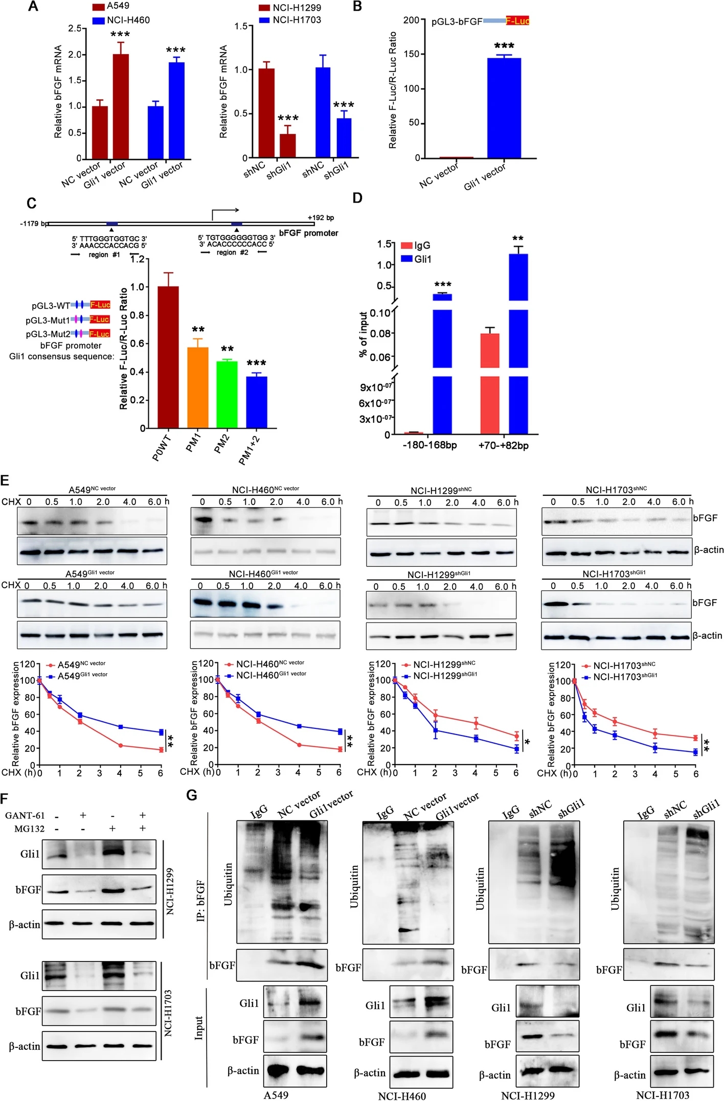 抑制肿瘤血管生成是NSCLC很有前景的治疗策略,越来越多的AADs被用于NSCLC的治疗。然而,AAD耐药的出现阻碍了其进一步发展。Gli1是肿瘤发生和侵袭的关键调节因子。前期研究表明,Gli1在NSCLC组织中水平升高,Gli1通过调控Snail的表达增强NSCLC的转移。由于肿瘤的转移需要血管生成,研究人员推测Gli1可能参与了NSCLC的血管生成过程。因此,研究人员验证了Gli1在NSCLC细胞中过表达促进血管生成。bFGF被确定为gli1介导的促血管生成作用的关键调节因子。此外,Gli1通过促进bFGF转录活性和减少bFGF蛋白降解来主动调节bFGF蛋白水平。另外,药物抑制Gli1可明显抑制肿瘤血管生成。综上所述,本研究为Gli1在NSCLC血管生成中的作用提供了新的机制见解。