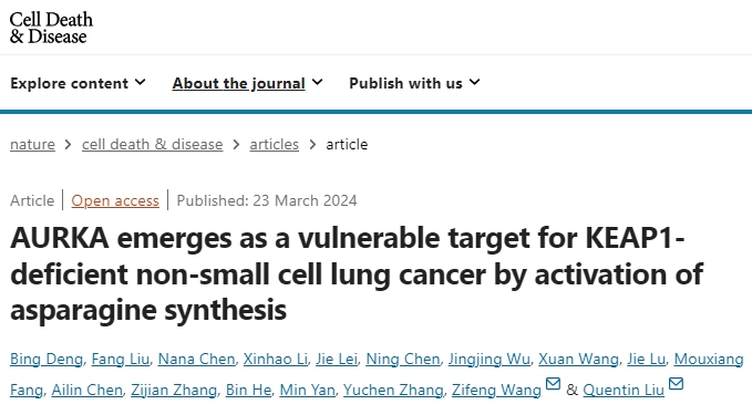 3月23日,中山大学研究团队在期刊《Cell Death&Disease》上发表了研究论文,题为“AURKA emerges as a vulnerable target for KEAP1-deficient non-small cell lung cancer by activation of asparagine synthesis”。本研究中,研究人员证明了AURKA调节氨基酸合成,使其成为KEAP1缺陷非小细胞肺癌(NSCLC)的脆弱靶点。从机制上讲,AURKA与eIF2α激酶GCN2相互作用,并保持其磷酸化,以调节eIF2α-ATF4介导的氨基酸生物合成。AURKA抑制抑制了天冬酰胺合成酶(ASNS)的表达,使得KEAP1-缺陷的NSCLC细胞易受AURKA抑制剂的影响,其中ASNS高表达。本研究揭示了AURKA在氨基酸代谢中的关键作用,并确定了AURKA抑制剂的特定代谢适应症。这些发现还为KEAP1-突变/缺陷NSCLC提供了新的临床治疗靶点,该疾病的特点是对放疗、化疗和靶向治疗具有耐药性。