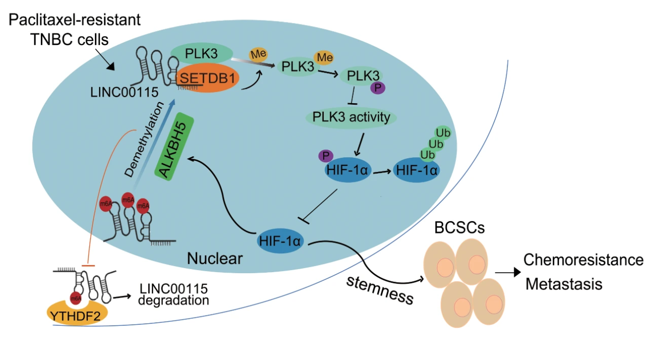 综上所述,研究结果揭示了LINC00115作为乳腺癌干细胞的关键调控因子,并强调了靶向LINC00115和SETDB1作为化疗耐药性乳腺癌的潜在治疗策略。(转化医学网360zhyx.com)