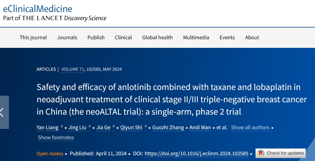 2024年4月11日,陆军军医大学齐晓伟、张毅、卞修武、姜军共同通讯在柳叶刀子刊《EClinicalMedicine》上发表题为“Safety and efficacy of anlotinib combined with taxane and lobaplatin in neoadjuvant treatment of clinical stage II/III triple-negative breast cancer in China (the neoALTAL trial): a single-arm, phase 2 trial”的研究报告,首次探讨了安罗替尼加入早期三阴性乳腺癌术前新辅助化疗的有效性和安全性。