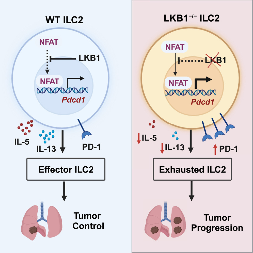 肿瘤抑制因子肝激酶B1 (LKB1)是一种多面丝氨酸/苏氨酸激酶,调节细胞代谢、极性和增殖。 STK11(编码LKB1)的种系突变促进Peutz-Jeghers综合征,该综合征易患癌症,到65岁时,有>90%的几率。STK11的体细胞突变与肺癌、宫颈癌和卵巢癌相关。LKB1失活突变被认为通过上皮细胞或基质细胞的细胞内源性肿瘤抑制作用促进癌症的发展。但最近的报道显示LKB1也参与调节抗肿瘤免疫。树突状细胞中LKB1的消融导致Treg细胞过度扩增并阻碍抗肿瘤免疫。事实上,LKB1与调节各种免疫细胞活化和功能有关。LKB1是T细胞发育和增殖所必需的。LKB1通过协调Treg细胞的代谢和免疫稳态来防止凋亡和功能衰竭。LKB1也限制巨噬细胞的活化和促炎细胞因子的产生。然而,目前尚不清楚LKB1是否在ILC2中发挥作用,并有助于癌症的发生和进展。