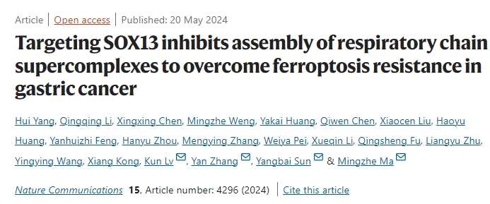 5月20日,复旦大学与非编码RNA基础与临床转化安徽省重点实验室以及皖南医学院第一附属医院(弋矶山医院)合作在期刊《Nature Communications》上发表了题为“Targeting SOX13 inhibits assembly of respiratory chain supercomplexes to overcome ferroptosis resistance in gastric cancer”的研究论文,在本工作中,基于之前在肿瘤代谢方面的研究,研究人员提出了一种潜在的导致铁死亡、化疗和免疫治疗耐药的代谢机制。研究人员证明靶向SOX13/SCAF1可抑制呼吸链超复合物(SCs)的装配,从而克服铁死亡介导的胃癌抗癌治疗耐药。