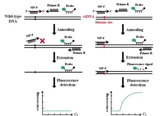 目前市场主流为ARMS+qPCR技术,采用TaqMan探针进行检测(比如肿瘤靶向用药EGFR基因检测,CFDA批准的检测试剂盒,90%以上都是ARMS检测方法)。