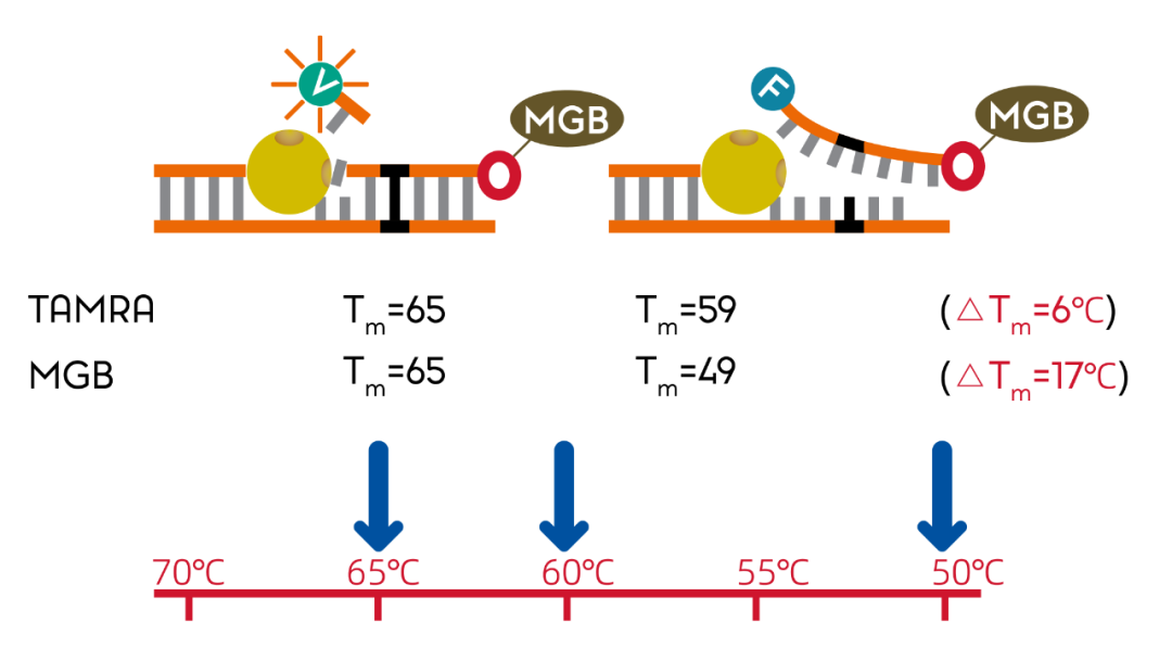 TaqMan-MGB探针技术是在TaqMan法基础上优化而成的一个SNP检测方法(由普通Taqman探针和MGB基团两部分组成),该探针的3’端结合了小沟结合物(minor groove binder,MGB),MGB与DNA螺旋的小沟(minor groove)契合,通过稳定DNA双螺旋结构来提高杂交的准确性和稳定性(图4)。