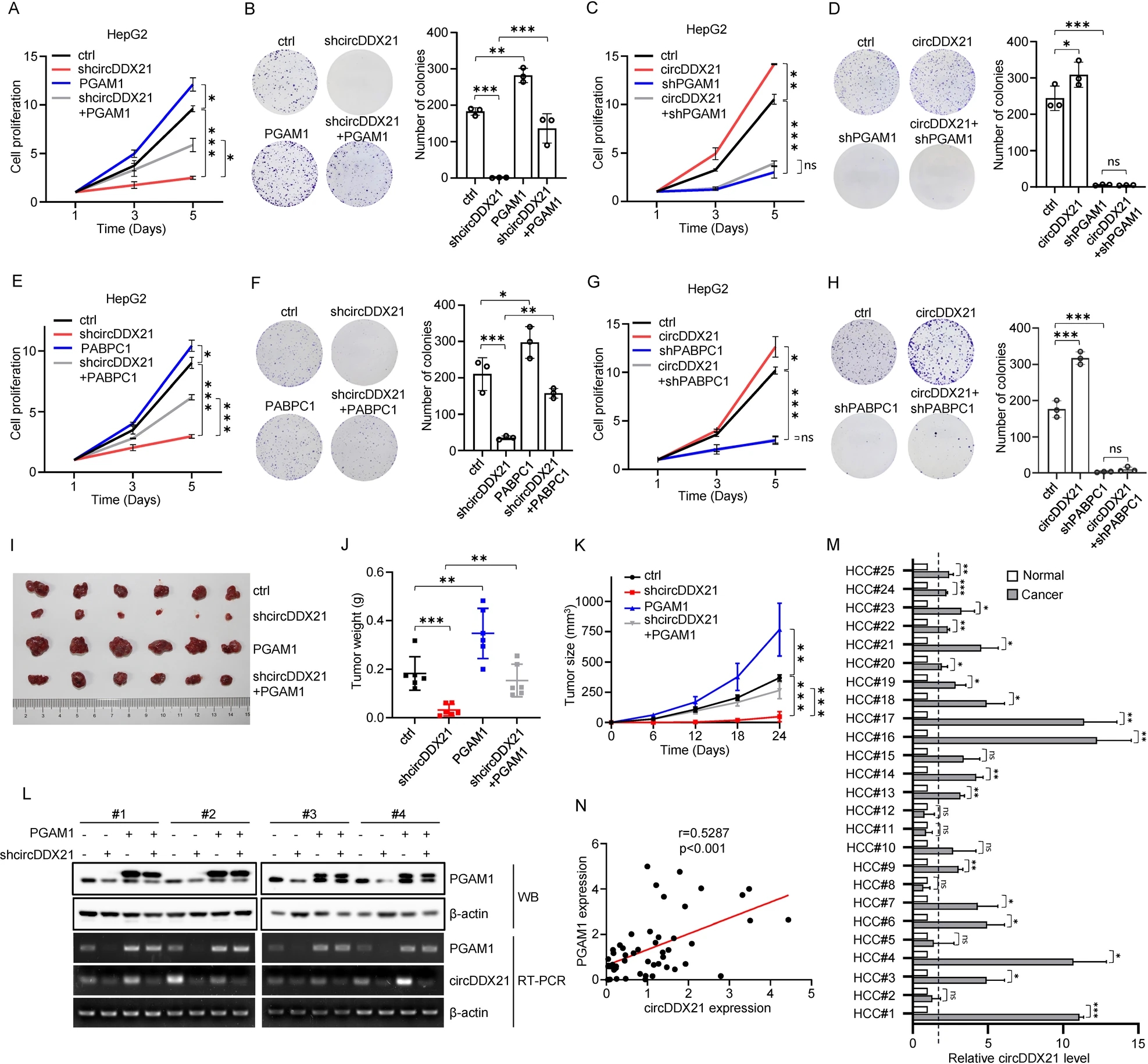 研究人员接下来评估了PABPC1在circDDX21促进细胞增殖中的功能作用。过表达PABPC1可显著恢复circDDX21敲低引起的细胞增殖和克隆形成能力的降低。此外,在对照细胞中,过表达circDDX21始终可显著促进细胞增殖和克隆形成,但在PABPC1敲低细胞中却未见此效应,这表明PABPC1在介导circDDX21对细胞增殖的促进作用中发挥着重要作用。研究数据还表明,PABPC1-PGAM1轴在circDDX21加速细胞增殖中发挥着重要作用。
