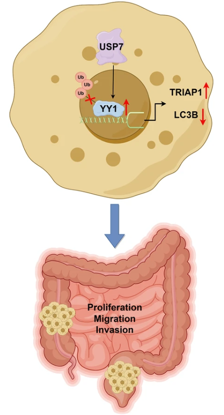 研究首次揭示了关于CRC中YY1和USP7之间独特关联的迷人发现。这种相互作用可能通过调节YY1的稳定性对CRC的恶性进展产生潜在影响。阻断YY1与USP7的联合治疗,可在一定程度上拮抗结直肠癌的增殖转移,为结直肠癌的治疗提供新的思路和靶点。