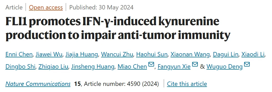 5月30日,中山大学邓务国、谢方云、陈淼共同通讯在期刊《Nature Communications》上在线发表题为“FLI1 promotes IFN-γ-induced kynurenine production to impair anti-tumor immunity”的研究论文,研究人员已经破译了免疫耐受的肿瘤内在机制,其中FLI1促进IFN-γ诱导的Kyn产生,从而损害T细胞介导的抗肿瘤免疫。基于这些发现,选择性靶向肿瘤FLI1活性成为癌症免疫治疗中一种很有前景的辅助策略。
