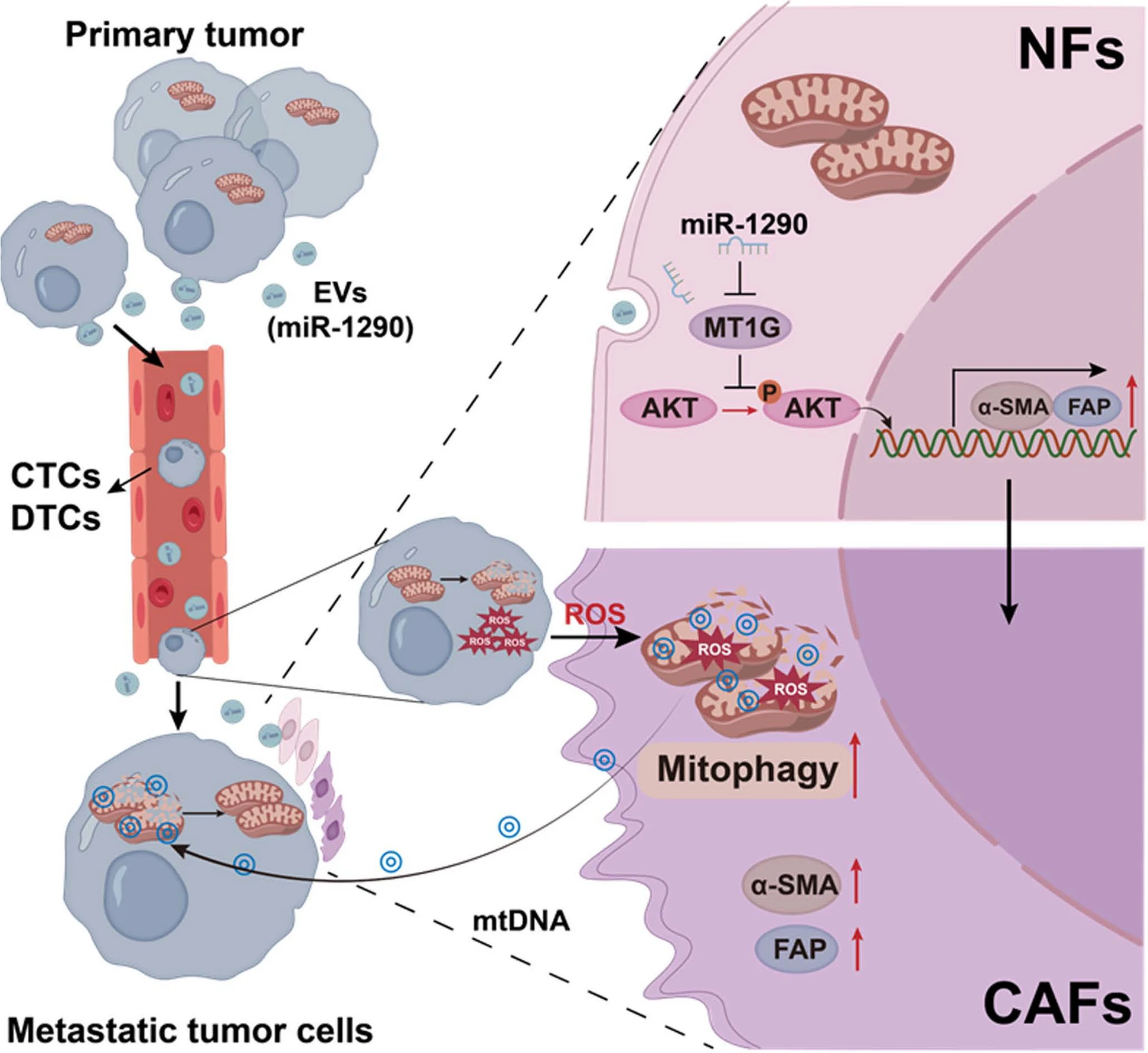 研究结果显示,来自高转移性肺癌细胞的EV包装了直接靶向MT1G的miR-1290,导致NF中AKT信号的激活并诱导NF转化为CAF。iCAFs表现出更高水平的自噬和线粒体自噬以及更多的mtDNA释放,活性氧(ROS)可以进一步促进这一过程。与iCAFs的条件培养基(CM)共培养后,ρ0细胞可以通过从CAF中获取mtDNA来恢复其线粒体功能,并进一步促进肿瘤转移。