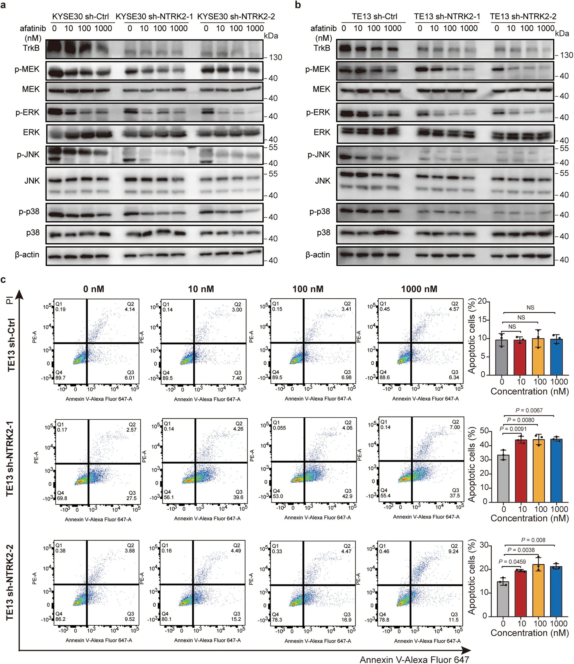 为了确定低表达NTRK2如何赋予ESCC细胞对阿法替尼的敏感性,研究人员分析了细胞周期、凋亡和关键信号通路的改变情况。细胞周期分析显示,阿法替尼在sh-Ctrl或sh-NTRK2 TE13细胞中未引起G0/G1期停滞,而在sh-NTRK2 TE1细胞中则有明显的G0/G1期停滞。此外,研究人员研究了TE13和TE1细胞系的凋亡情况。在NTRK2被抑制的TE13和TE1细胞中,在10 nM和100 nM浓度下检测到了广泛的凋亡,而在sh-Ctrl表达的TE13和TE1细胞中,在1000 nM浓度下仅观察到轻微的凋亡诱导。完全抑制细胞周期停滞和凋亡所需的浓度显著低于高表达NTRK2的细胞。