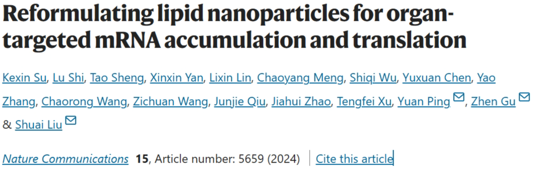 2024年7月5日, 浙江大学药学院刘帅团队在期刊《Nature Communications》上发表了题为“Reformulating lipid nanoparticles for organ-targeted mRNA accumulation and translation”的研究论文。团队通过消除胆固醇和磷脂,保留LNP功能,并赋予名副其实的靶向性,来创新LNP递送技术。