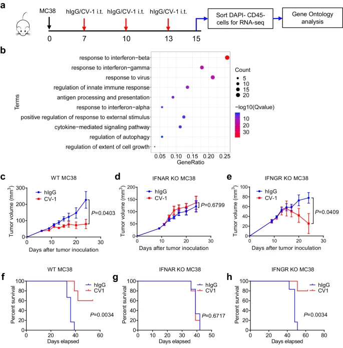 为了研究免疫治疗期间肿瘤细胞的反应性,用突变体SIRPα-Fc(hIgG1)融合蛋白(CV-1)处理已建立的小鼠MC38肿瘤,它是一种用于CD47阻断或控制hIgG的高亲和力试剂。在3次处理后,对肿瘤细胞进行分选,以进行RNA-seq分析。实验结果显示,在CD47-SIRPα阻断治疗期间,肿瘤细胞中的IFN-I通路被激活,并且肿瘤细胞固有的I型,而非II型IFN信号传导,对于CD47-SIRPα阻断疗法在小鼠中的治疗效果,至关重要。