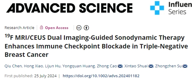 7月25日,中山大学苏中振研究团队在期刊《Advanced Science》上发表了研究论文,题为“19F MRI/CEUS Dual Imaging-Guided Sonodynamic Therapy Enhances Immune Checkpoint Blockade in Triple-Negative Breast Cancer”,本研究中,研究人员开发了一种脂质体纳米药物(LP@PFH@HMME),将显像剂和治疗剂结合在一起,用于双模态成像引导的声动力治疗(SDT)。该药物可增强免疫原性,从而通过免疫检查点阻断(ICB)对三阴性乳腺癌进行有效的免疫治疗。在酸性肿瘤微环境(TME)中,由于PH响应性脂质融合,LP@PFH@HMME发生了“纳米-微”转化,这使得液滴在超声造影(CEUS)和SDT研究中对超声(US)更加敏感。该纳米药物通过氟-19磁共振成像(19F MRI)和超声造影双模态成像显示出稳健的双模态成像能力,在19F含量较高的水溶液中表现出良好的溶解性和较长的横向弛豫时间(T2 = 1.072 s),适用于高性能的19F MRI,此外尾静脉注射后纳米药物可有效蓄积。因此,19F MRI/CEUS双重成像可以显示超声辐照肿瘤部位的足够时间点,从而诱导高效的SDT,产生大量的活性氧(ROS)触发免疫原性细胞死亡(ICD),以辅助基于ICD的免疫治疗。声动力联合免疫治疗的治疗设计有效抑制了TNBC的生长和复发,凸显了多功能纳米药物治疗TNBC的前景。