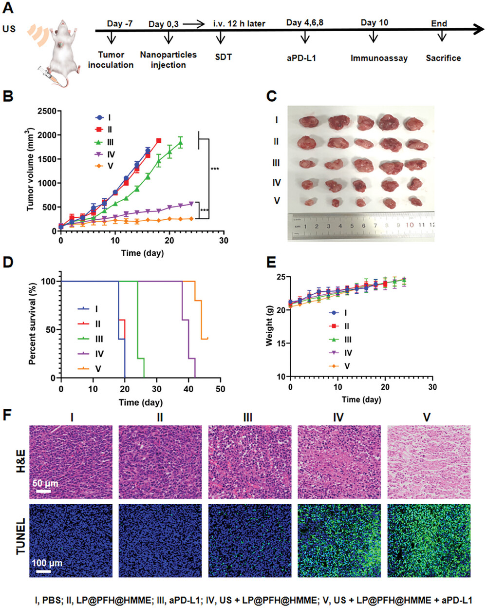图1:基于LP@PFH@ hmme的声动力免疫疗法的体内抗肿瘤治疗效果