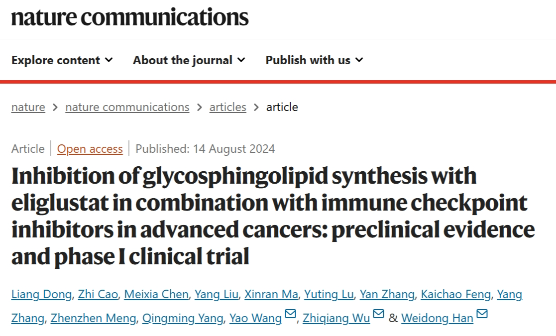 【Nature子刊】韩为东团队揭示新突破:Eliglustat联合免疫检查点抑制剂显著提升癌症治疗效果