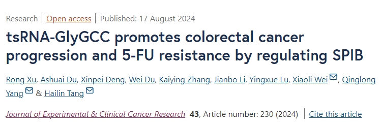 8月17日,中山大学研究团队与贵州省人民医院研究人员合作在期刊《Journal of Experimental & Clinical Cancer Research》上发表了题为“tsRNA-GlyGCC promotes colorectal cancer progression and 5-FU resistance by regulating SPIB”的研究论文,在这项研究中,研究人员揭示了人结直肠癌组织中tRNAs的特征,并确认了一种特定的5'tiRNA-Gly-GCC(tsRNA-GlyGCC),其在结直肠癌组织中上调,并由METTL1介导的N(7)-甲基鸟苷tRNA修饰所调节。体外和体内实验揭示了tsRNA-GlyGCC在结直肠癌5-FU耐药中的致癌作用。尤其是,本研究结果表明,tsRNA-GlyGCC通过靶向SPIB调节JAK1/STAT6信号通路。合成聚(β-氨基酯)辅助递送5-FU和tsRNA-GlyGCC抑制剂,可有效抑制肿瘤生长,增强结直肠癌对5-FU的敏感性,且对皮下肿瘤无明显不良影响。综上,本研究揭示了CRC进展过程中特有的tsRNA-GlyGCC参与的通路。将tsRNA-GlyGCC作为靶点与5-FU联合治疗可能为治疗5-FU耐药性CRC提供了有前景的纳米疗法策略。