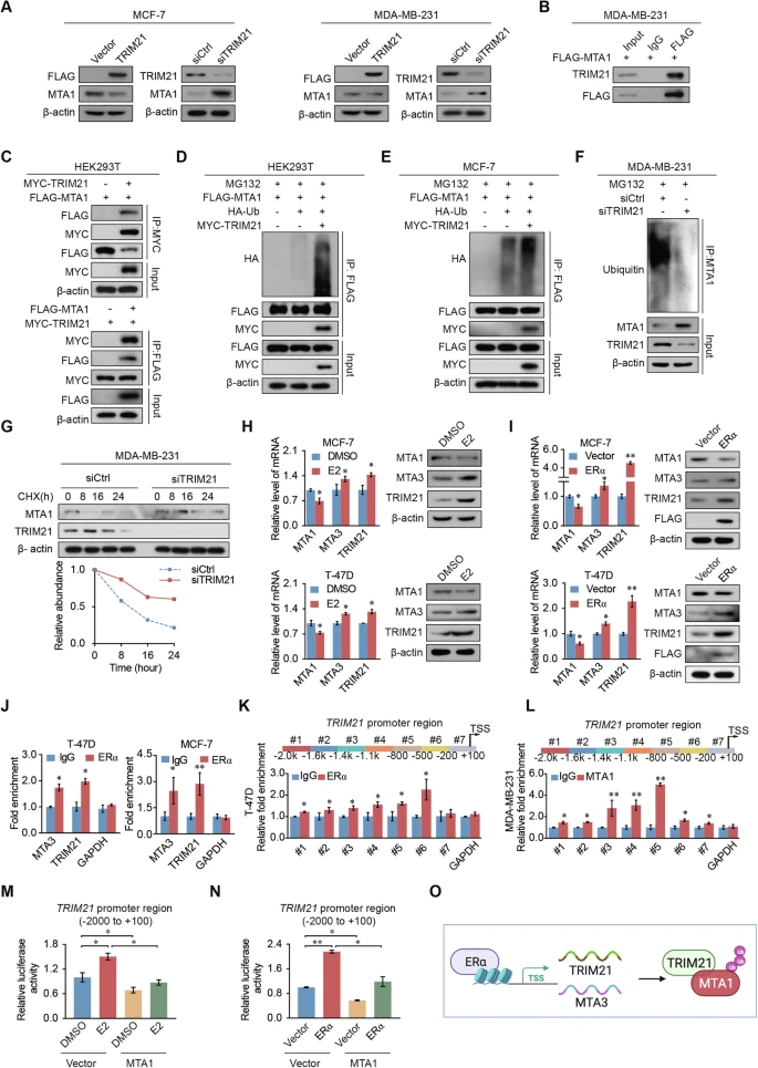 MTA1表达受TRIM21介导的泛素化调控,ERα促进TRIM21转录激活。