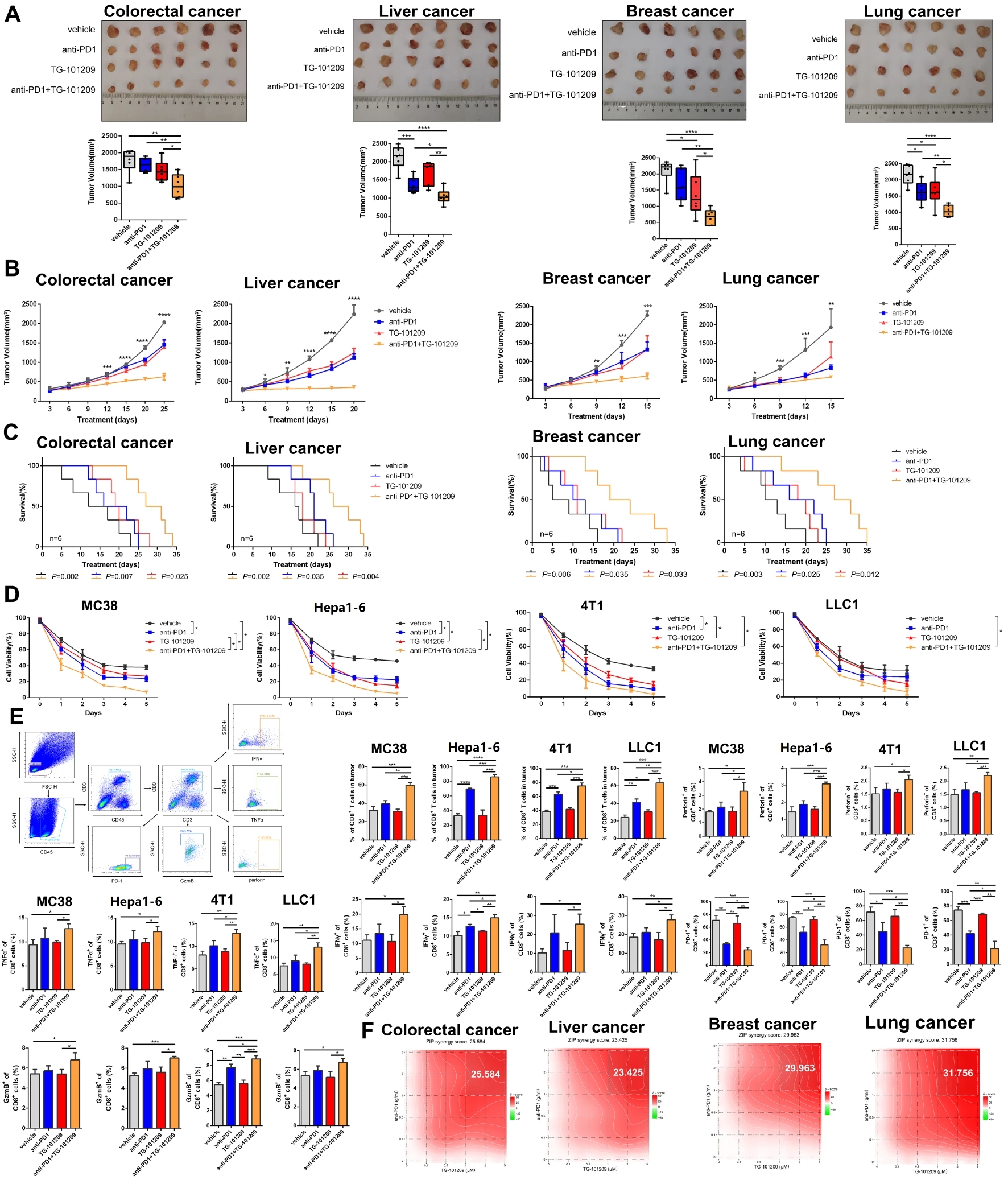 研究人员观察到,与抗pd1或TG-101,209单独治疗相比,抗pd1和TG-101,209联合治疗在缩小肿瘤体积和延长荷瘤小鼠生存期方面具有更大的影响。联合治疗也对肿瘤细胞活力产生了更强的抑制作用。对获取的肿瘤进行的流式细胞术分析表明,CD8+PD1+T细胞的浸润减少,但CD8+T细胞的比例改善,CD8+T细胞内的功能性因子(IFNγ、TNFα、GZMB和穿孔素)增加。研究人员评估了anti-PD1和TG-101,209之间的相互增强程度,显示出强大的ZIP协同评分。