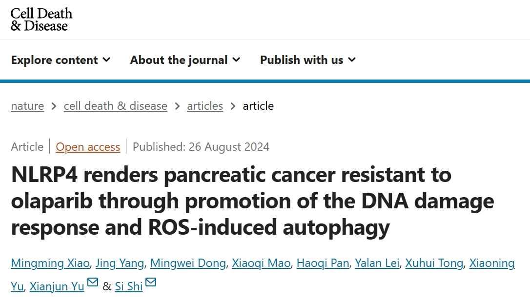 2024年8月26日,复旦大学附属肿瘤医院施思团队在期刊《Cell Death & Disease》上发表了题为“NLRP4 renders pancreatic cancer resistant to olaparib through promotion of the DNA damage response and ROS-induced autophagy”的研究论文。研究结果强调了用奥拉帕尼治疗胰腺癌细胞时,NLRP4在自噬和DNA修复过程中发挥的重要作用,从而表明奥拉帕尼在NLRP4表达低的胰腺癌患者中的潜在治疗效用。