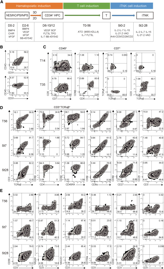 淋巴样细胞来源于造血干细胞/祖细胞,因此,需要诱导HPC作为初步步骤。通过优化团队之前的协议,团队成功地建立了一个化学定义的方案,用于3D和2D系统中序贯中胚层诱导和造血诱导。这是使用人CiPSC(hCiPSC)系CiPS-3、hESC系H1和hiPSC系iPS-7实现的。在3D系统中,hPSCs发生自聚集,形成胚胎体。经过10天的诱导期后,团队获得了CD34 HPC,由大约2/3的CD31CD43CD45细胞和1/3的CD31CD43组成CD45系列细胞。在2D系统中,hPSC接种在玻连蛋白包被的平板上,并以2D形态分化。经过12天的诱导期后,产生的CD34HPC主要是CD31CD43CD45细胞。CD34 HPC在3D和2D系统中的平均纯度,约为24%和30%。就产量而言,100万个hPSC在3D系统中产生了大约45万个CD34HPC,而它们在2D系统中产生了316万个CD34 HPC。在两个系统中,所有3种细胞系,都可以分化为HPC。