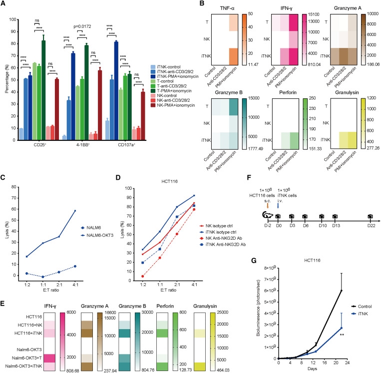 iTNK细胞在3周内显著抑制HCT116结直肠癌异种移植模型中的肿瘤生长,而不会对小鼠体重或外观造成不利影响。在iTNK细胞注射后3天,检测到小鼠血液中穿孔素、颗粒溶血和IFN-γ的释放。观察到iTNK细胞浸润到肿瘤、肝脏、肺和脾脏中。这些结果表明iTNK细胞的体内功能。