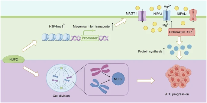 在这项研究中,团队研究了NUF2在ATC中的作用和机制。团队发现NUF2表观遗传,调控镁转运蛋白的转录,从而通过ATC中的PI3K/Akt/mTOR通路,促进蛋白质合成。研究结果扩展了NUF2在蛋白质合成和ATC进展过程中,作为镁稳态的新兴调节因子的概念。