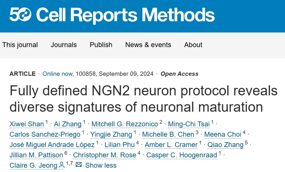 2024年9月9日, 基因泰克公司Claire G. Jeong团队在期刊《Cell Reports》上发表了题为“Fully defined NGN2 neuron protocol reveals diverse signatures of neuronal maturation”的研究论文。在这项研究中,团队提出了一种利用克隆、靶向工程iPSC系和确定的试剂,生成神经元的标准化方法。团队证明了大规模兴奋性神经元的持续产生和至少150天的长期维持。团队还展示了这些神经元中疾病相关基因的表达,以证明协议与模拟神经系统疾病的相关性。最后,团队展示了NGN2整合的iPSC系的高效生成。这些工作流程、分析数据和功能表征,使神经系统疾病的可重复人类体外模型的开发,成为可能。