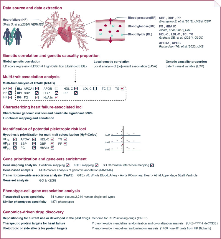 在这项研究中,团队评估了HF与BLs 、 BP和BG性状之间的全局和局部遗传相关性。潜在因果变量模型(LCV)用于进一步评估HF,与这些性状之间的遗传因果关系比(GCP)。团队还对GWAS(MTAGs)进行了多性状分析,进一步探索HF的新风险位点,并揭示其合并症背后的共同遗传病因基础。最后,团队应用了一套全面的GWAS后分析,来探索具有这些特征的HF的基因、通路和治疗靶点。