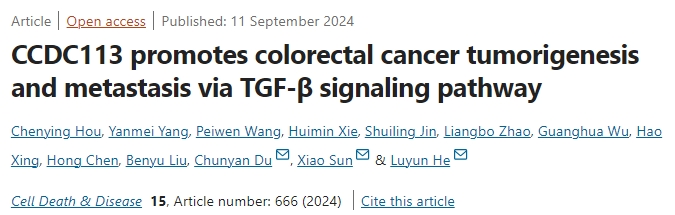9月11日,郑州大学研究团队在期刊《Cell Death&Disease》上发表了题为“CCDC113 promotes colorectal cancer tumorigenesis and metastasis via TGF-β signaling pathway”的研究论文,在这项研究中,研究人员发现CCDC113在结直肠癌中表达显著升高,CCDC113的高表达与结直肠癌患者的不良预后显著相关,CCDC113是结直肠癌肿瘤生成和转移所必需的。RNA-seq和TCGA数据库分析表明,CCDC113与TGF-β信号通路呈正相关。TGF-β信号通路抑制剂加仑塞替可以在体外和体内逆转由CCDC113过表达引起的结直肠癌细胞增殖和迁移能力增强。这些结果表明,CCDC113通过TGF-β信号通路促进结直肠癌的肿瘤生成和转移。总之,这是首次探索CCDC113在结直肠癌肿瘤生成和转移中的功能和机制,CCDC113可能成为结直肠癌干预的潜在生物标志物和治疗靶点。