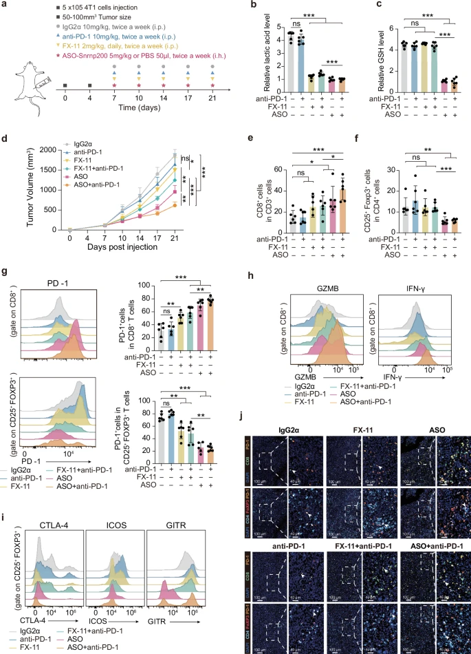 在MPS2肿瘤细胞(4T1) 中,ASO-Snrnp200在体外降低了细胞内和细胞外的乳酸和谷胱甘肽水平。一致地,ASO-Snrnp200治疗显著降低体内4T1异种移植肿瘤中Snrnp200表达,以及乳酸和谷胱甘肽水平。与LDH抑制剂FX-11联合抗PD-1相比,ASO-Snrnp200和抗PD-1的共同给药,显著抑制了肿瘤生长。联合治疗组中的CD8 T细胞表现出IFN-γ和颗粒酶B产生增加。联合疗法下调了Tregs中FOXP3和PD-1的表达,并降低激活标志物(CTLA-4 、 ICOS和GITR的表达)。CD8 T细胞和Tregs肿瘤的mIHC染色,一致验证了这些观察结果。研究结果强调了ASO-Snrnp200提高免疫治疗疗效的潜力,突出了它在调节肿瘤微环境动力学中的作用,这对治疗结果有益。