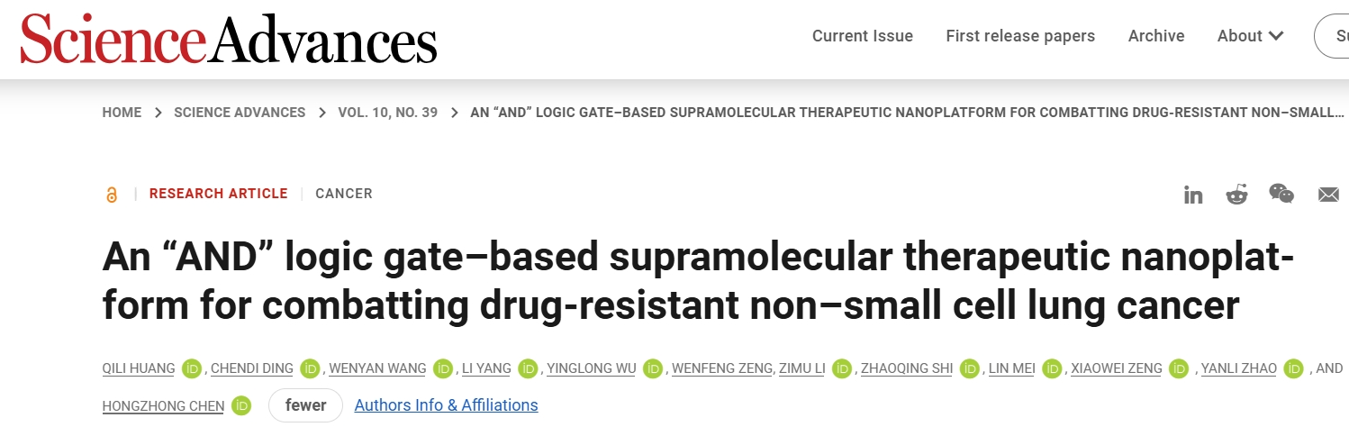 2024年9月25日,中山大学药学院(深圳)陈洪中团队在期刊《Science Advances》上发表了题为“An “AND” logic gate–based supramolecular therapeutic nanoplatform for combatting drug-resistant non–small cell lung cancer”的研究论文。研究结果表明,团队设计的药物递送系统提供了一种高度受控和靶向的治疗方法,有效抑制肿瘤生长,抑制旁路信号通路,克服EGFR-TKI耐药,从而为最大化治疗效果提供了潜在的解决方案。