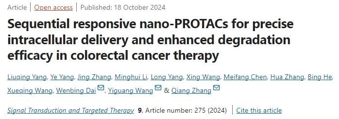 10月18日,北京大学研究团队在期刊《Signal Transduction and Targeted Therapy》上发表了研究论文,题为“Sequential responsive nano-PROTACs for precise intracellular delivery and enhanced degradation efficacy in colorectal cancer therapy”,本研究选择了对许多治疗甚至免疫检查点抑制剂都几乎没有反应的结直肠癌作为肿瘤模型。结果发现,PSRNs在循环中保持纳米结构(40 nm),并通过增强渗透和滞留效应在肿瘤中有效聚集。然后,在酸性肿瘤微环境中,它们被分解成unimer (<10 nm),促进肿瘤穿透和细胞内化。最后,降解CDK4/6的PROTACs在组织蛋白酶b裂解后被释放到细胞内。重要的是,PSRNs在体外和体内均促进了靶蛋白的降解。CDK4/6的降解通过上调癌细胞中程序性细胞死亡配体1 (PD-L1)的表达和抑制肿瘤微环境中的调节性T细胞增殖,也增强了免疫检查点阻断剂的疗效。在CT26肿瘤模型中,联合应用α-PD-1可获得较好的抗肿瘤效果。总之,本研究验证了细胞内精确递送PROTACs的意义,并为结直肠癌的靶向联合治疗介绍了一种有前景的治疗策略。