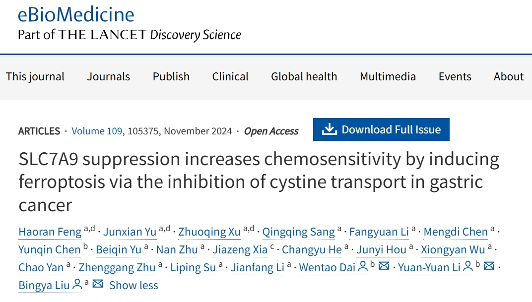 2024年10月21日,上海交通大学医学院附属瑞金医院刘炳亚团队在期刊《eBioMedicine》上发表了题为“SLC7A9 suppression increases chemosensitivity by inducing ferroptosis via the inhibition of cystine transport in gastric cancer”的研究论文。研究结果表明,SLC7A9作为铁死亡抑制剂,独立于SLC7A11。因此,针对SLC7A9的治疗干预有望使胃癌细胞对铁死亡和化疗治疗敏感,并最终改善胃癌患者的预后。