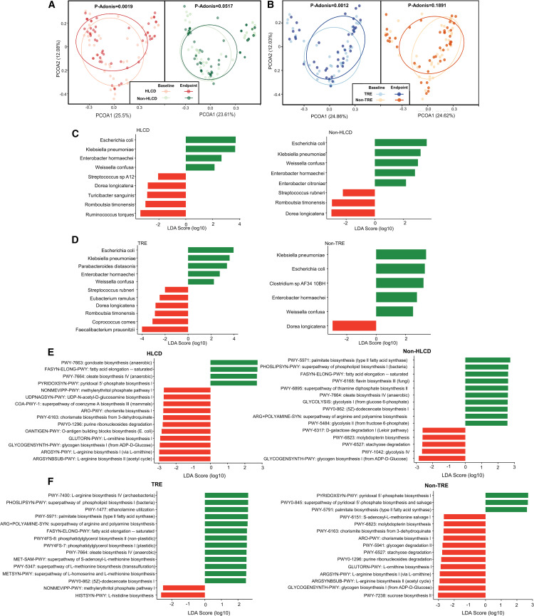 2. HLCD和TRE都能显著改变肠道微生物组和微生物-宿主共代谢物,HLCD通过下调氨基酸生物合成并减少粪便中的支链氨基酸(BCAAs)来发挥作用。TRE增加了参与短链脂肪酸合成的益生菌种类的丰度,并提高了粪便中DCA和IAA的浓度。