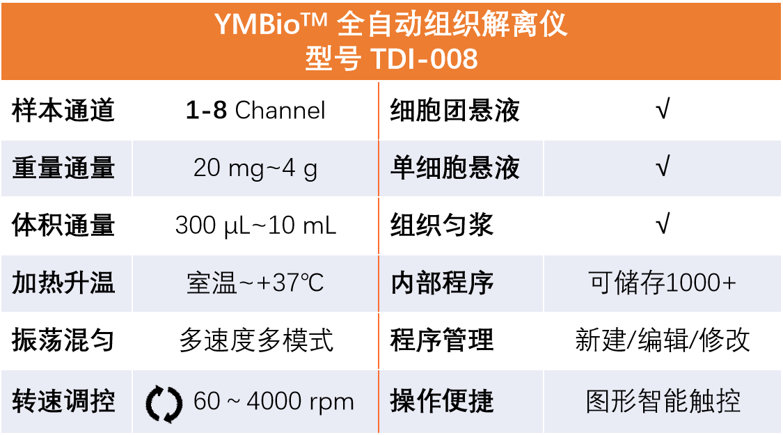 TDI-008采用预设定的优化程序提供稳定、精准、可靠的单细胞解离和组织匀浆,综合机械解离和热酶法解离的优点,搭配组织解离试剂盒可最大化获得高得率高活性单细胞悬液。