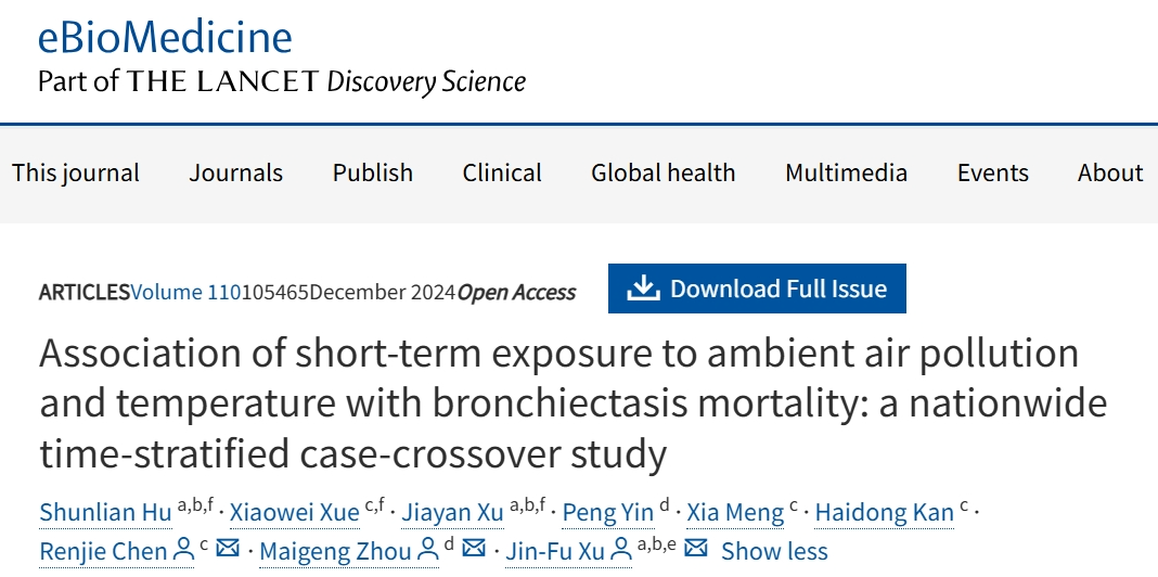 2024年11月21日,复旦大学附属华东医院徐金富团队在期刊《eBioMedicine》上发表了题为“Association of short-term exposure to ambient air pollution and temperature with bronchiectasis mortality: a nationwide time-stratified case-crossover study”的研究论文。团队共纳入了19,320例支气管扩张症死亡病例。空气污染物与接触后3天内的支气管扩张症死亡率相关,接触-反应关系几乎呈线性。此外,温度越低,支气管扩张死亡率越高。