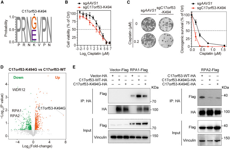 这些数据表明,K494是新发现的C17orf53的一个关键残基,它的突变破坏了C17orf53与其上游因子RPA的相互作用,导致严重的ICL修复缺陷、G2/M细胞周期停滞以及对顺铂治疗的超敏性。