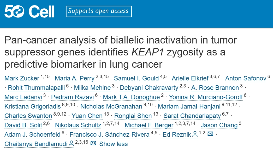 2024年12月18日,美国纪念斯隆凯特琳癌症中心Chaitanya Bandlamudi教授团队在期刊《Cell》上发表了题为“Pan-cancer analysis of biallelic inactivation in tumor suppressor genes identifies KEAP1 zygosity as a predictive biomarker in lung cancer”的研究论文。研究结果表明,可以利用双链失活的选择来识别非典型环境中的驱动基因,包括KEAP1等几个TSG的意义不明变体(VUS)。KEAP1 VUS与KEAP1已确定的致癌等位基因表型相同,而且基因杂合度而非变异分类可预测治疗反应。因此,TSG的等位基因是疾病病因学和治疗敏感性的基本决定因素。