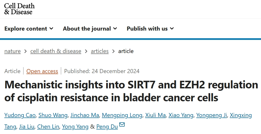 2024年12月24日,北京大学肿瘤医院泌尿外科杜鹏教授团队在期刊《Cell Death & Disease》上发表了题为“Mechanistic insights into SIRT7 and EZH2 regulation of cisplatin resistance in bladder cancer cells”的研究论文。研究结果表明,SIRT7与膀胱癌细胞对铂类化疗和CDDP的敏感性有关。靶向SIRT7和EZH2,可能是提高CDDP治疗膀胱癌疗效的一种可行方法。