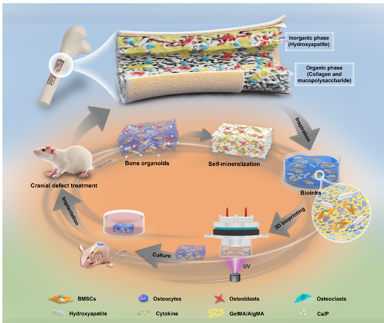 骨类器官作为研究骨发育及相关疾病的强大工具,近年来受到广泛关注。然而,现有方法设计较为简化,在一定程度上限制了其应用潜力。这些方法生成的骨类器官无法有效模拟骨组织的微结构,也难以实现高效的矿化过程。为解决这一问题,我们提出一种基于三维(3D)构建的创新策略,利用骨髓来源的间充质干细胞(BMSCs)生成矿化骨结构。通过将BMSCs与水凝胶混合,制备仿骨基质的生物墨水,并结合基于投影的光固化3D打印技术,我们成功构建了3D打印结构。这些结构随后被移植至裸鼠皮下,远离天然骨微环境。即使在无外部刺激的条件下,这些植入物也能自发形成矿化的骨结构。随着长期培养,这些结构逐渐成熟,最终分化为完整的骨组织,并完成矿化和血管化的过程。我们构建的骨类器官模型为研究骨发育、探讨先天性疾病机制、开展药物筛选和开发骨修复治疗方案提供了一个全新的平台。