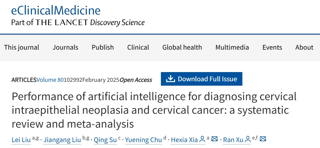 2024年12月28日,浙江大学Ran Xu教授团队在期刊《eClinicalMedicine》上发表了题为“Performance of artificial intelligence for diagnosing cervical intraepithelial neoplasia and cervical cancer: a systematic review and meta-analysis”的研究论文。研究结果凸显了人工智能在预防和早期诊断宫颈癌方面的潜力和实用价值。进一步的研究应支持人工智能在宫颈癌筛查方面的发展,包括在资源有限的中低收入国家。