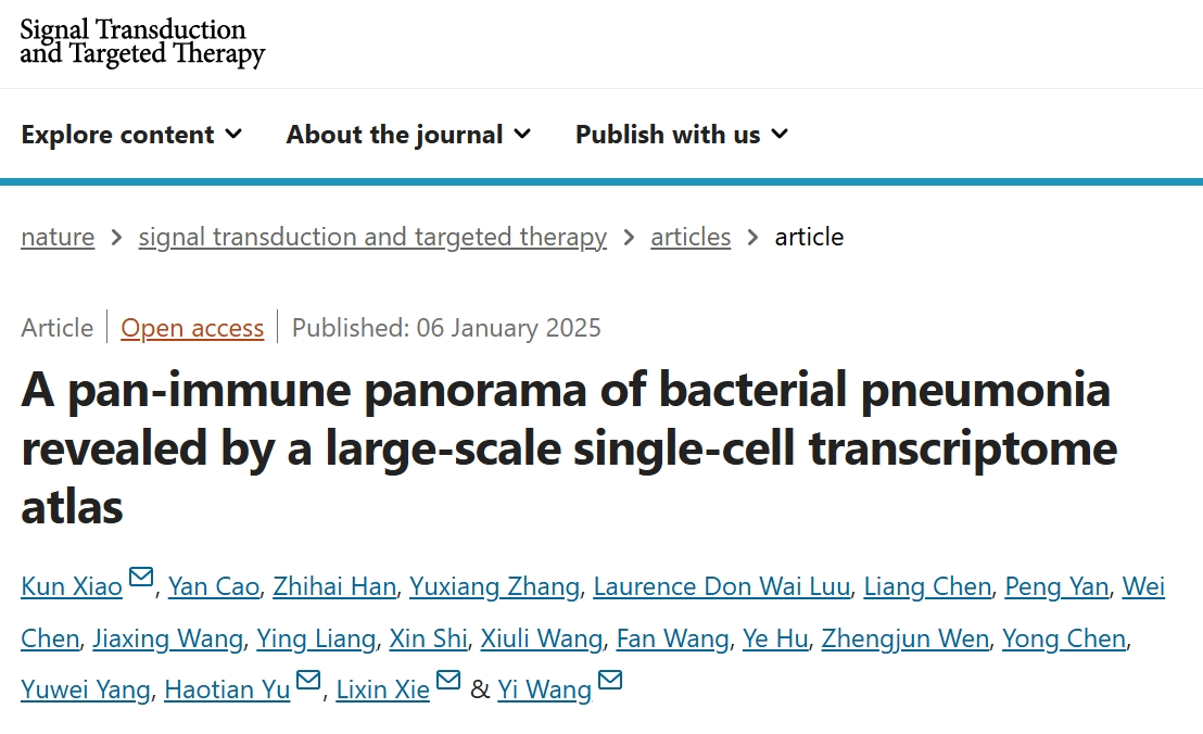 2025年1月6日,中国人民解放军总医院解立新、肖坤、曹彦教授团队与首都儿研所王毅教授等团队在期刊《Signal Transduction and Targeted Therapy》上合作发表了题为“A pan-immune panorama of bacterial pneumonia revealed by a large-scale single-cell tranome atlas”的研究论文。研究发现,细菌性肺炎的免疫反应具有异质性,不同的免疫细胞特征与疾病的严重程度有关。重症细菌性肺炎表现为炎性细胞因子风暴,主要是由于特定的巨噬细胞和中性粒细胞亚群导致的全身性S100A8/A9和CXCL8上调。相比之下,轻度细菌性肺炎表现出有效的体液免疫反应,其特点是T滤泡辅助细胞和T辅助细胞2的扩增,促进B细胞的活化和抗体的产生。中性粒细胞和巨噬细胞反应失调是重症病例发病机制的重要原因。
