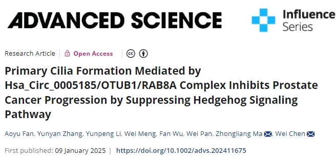 1月9日,复旦大学/上海大学研究人员合作共同在期刊《Advanced Science》上发表了题为“Primary Cilia Formation Mediated by Hsa_Circ_0005185/OTUB1/RAB8A Complex Inhibits Prostate Cancer Progression by Suppressing Hedgehog Signaling Pathway”的研究论文,本研究中,研究人员确定了与前列腺癌进展及恩杂鲁胺耐药性相关的关键环状 RNA。具体而言,研究人员发现 hsa_circ_0005185 与 OTUB1 和 RAB8A 相互作用。hsa_circ_0005185 介导去泛素化酶 OTUB1 与 RAB8A 的结合,导致 RAB8A 的去泛素化。因此,RAB8A 的稳定表达促进初级纤毛的再生,并增强 Hedgehog 信号通路抑制因子 GLI3R 的产生,从而抑制 AR 活性,减缓 CRPC 的进展。
