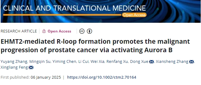 1月6日,苏州大学/安徽医科大学合作共同在期刊《Clinical And Translational Medicine》上发表了研究论文,题为“EHMT2-mediated R-loop formation promotes the malignant progression of prostate cancer via activating Aurora B”,本研究发现 Cullin 3(CUL3)-EHMT2-Aurora B 信号级联对于前列腺癌细胞在有丝分裂期间管理染色体不稳定性至关重要。临床数据集分析和组织样本显示,EHMT2 在晚期前列腺癌样本中的表达显著上调,并且与不良预后相关。总之,本研究结果强调了前列腺癌中 EHMT2 表达升高的预后价值,并揭示了 EHMT2 驱动前列腺癌进展和耐药性的新机制。
